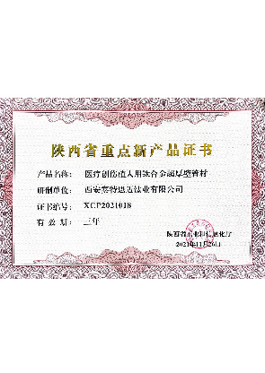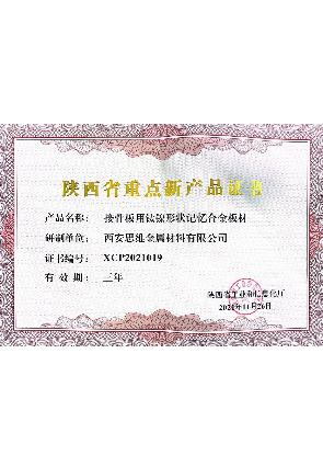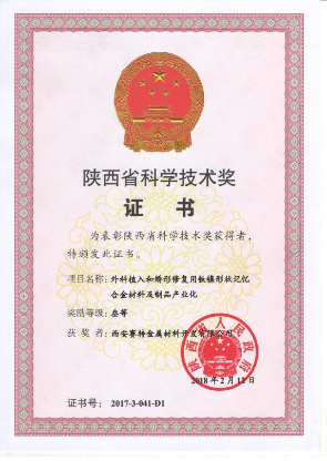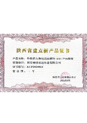 陜西省重點新產品:“外科植入用高品質Ti-6Al-7Nb棒材”、“醫療創傷用鈦合金超厚壁管材”、“接骨板用鈦鎳形狀記憶合金板材”